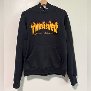 • Thrasher Magazine hoodie featuring the iconic flame logo in bold yellow and red on a black background