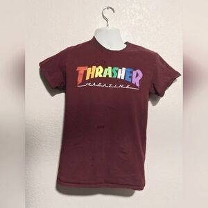 #Thrasher Women's GUC Burgundy Tee with rainbow lettering. Authentic #vintage t-shirt boasting 100% cotton.