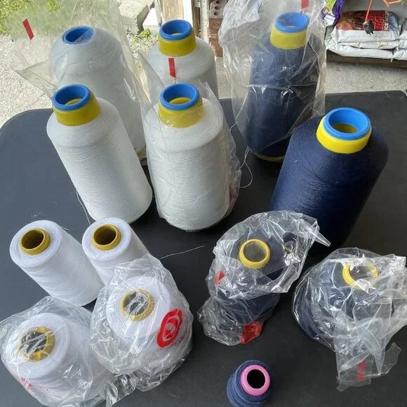 Thread Spools, small and large, navy blue and white (see picture for sizes.) Inventory from our family sports store in the 1980's.