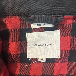 Thread & Supply black denim backet with buffalo check plaid lining. Relaxed fit with a trucker style silhouette, button front, chest and side pockets. Excellent pre-owned condition with do stains or damage. Measurements shown in photos