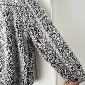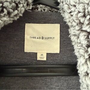 Cozy teddy jacket by Thread & Supply. Features a soft, plush texture. Ideal for layering in cooler weather. Size M. Snap button closure draw cord at the waist to tighten. Pocket at the chest.