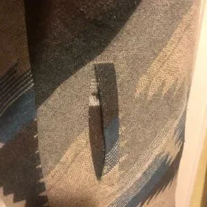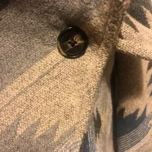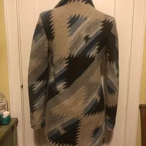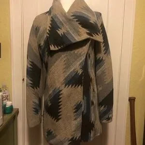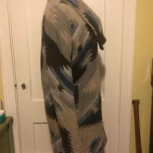 Cozy western Aztec wrap jacket with geometric design. Features blue and gray tones. Lined inside and has pockets.