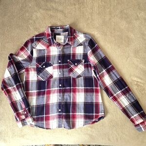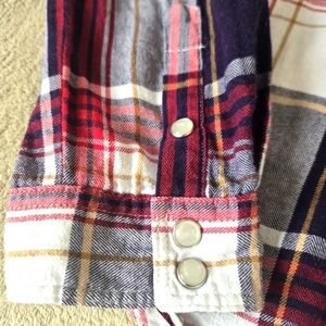 Women’s Thread & Supply flannel plaid button-up shirt, size M. Long sleeve, snap closures, dual chest pockets, soft lightweight fabric, 100% cotton