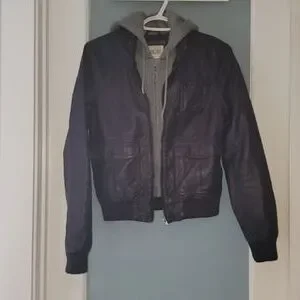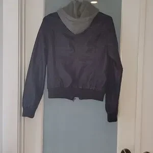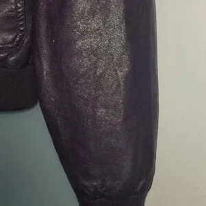 This incredibly cute bomber jacket is a plum color. Slight piling om cuffs, micro dot on pleather material. see picture.