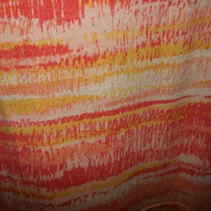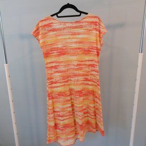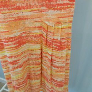 Orange, yellow and peach sunset colored t-shirt dress. Pleating detail on front at waist.