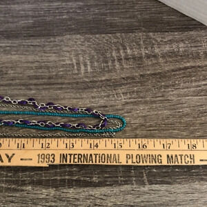 Purple string intertwined in a chain, a teal beaded strand and a plain chain strand.