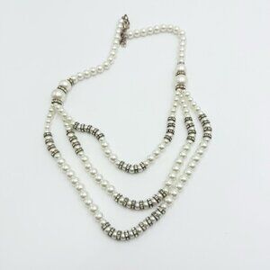 Three Strand White Glass Pearl Necklace with Crystal Accents