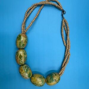 This necklace is made of five large oval beads and lined by tiny light wooden beading. Very unique and tropical!