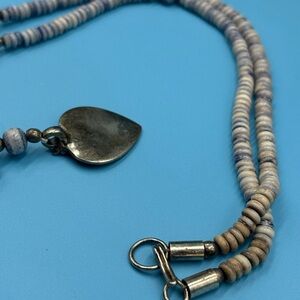 Goegeous pale blue beads with a metal silver heart pendant.