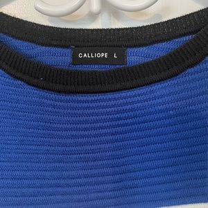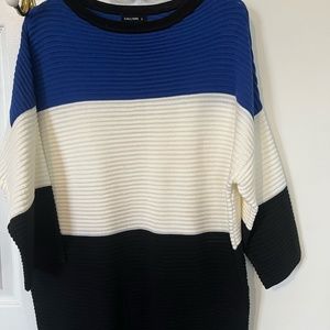 Modern European Calliope design. Three colours dress - navy blue, white and black that you can wear with boots or shoes. Knee length. Comfortable to wear, modern ribbed knit and simple dress. Can be combine with large jewelry for festive occasions or enjoy a modern look for every day - casual. Worn once. Very good condition. Size L.