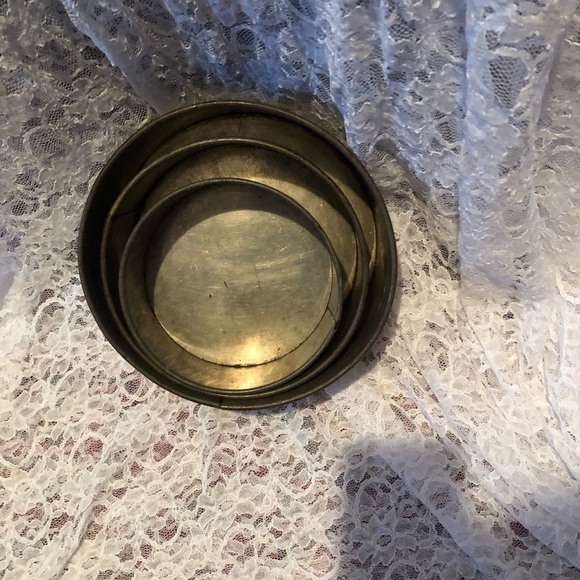 Set of three vintage fruitcake/ wedding cake baking tins/ removable bottoms. These cake pans have been in storage for several years now. Used for making fruitcake and or wedding cakes, these tins are a great addition to a Baker’s kitchen. The bottoms are removable. Please check pics as these are used and have blemishes but can still be used.