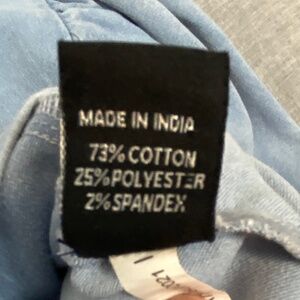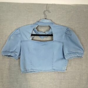 Thrill Jeans Crop Top. Women's Tag Size Medium. Cotton / poly / spandex blend. Stretchy. Light wash blue. Chest and back cut out. Princess sleeves.