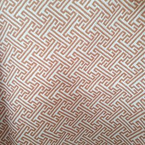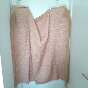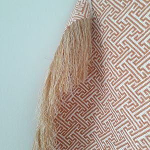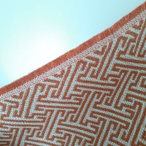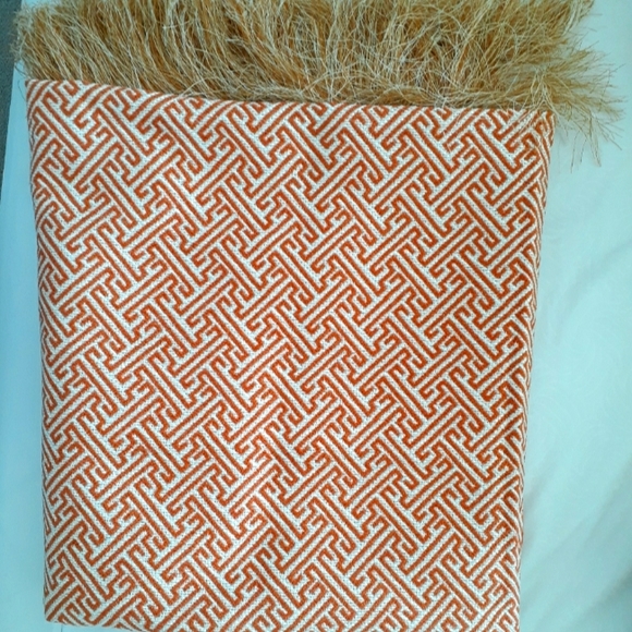 Orange and white throw. Beige threading. (60×56"). Made from thrifted material. Hand Fringed. I don't know this particular material. Weaved texture.