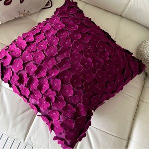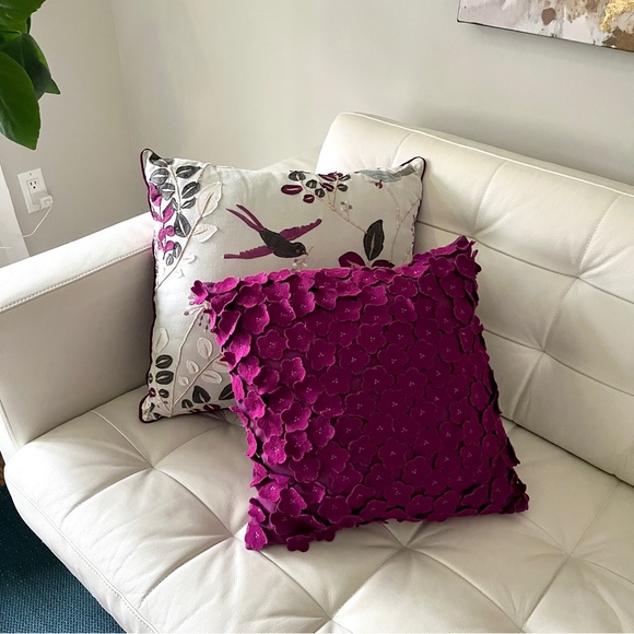 Set of two (2) purple, spring (birds, plants and flowers) themed throw pillow covers (inserts not included). Originally purchased in the UK at popular department store Selfridges. Pillow covers are of a polyester blend. The 3D flower cutouts on the smaller pillow feel like a soft felt.