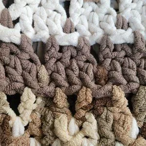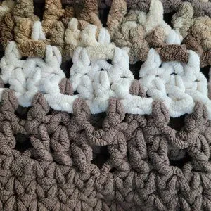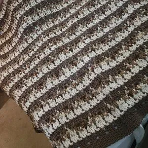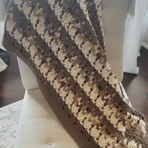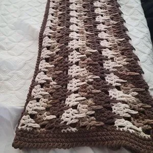 64 x 72 oversized throw in a chenille with some stretch. Super soft and comfortable. Perfect for a sofa, chair, on a a bed as a throw or bed scarf. Main colors are brown and beige, with taupe, cream and caramel. No fringes as a bonus for those that don't like to detangle. Bordered in brown.