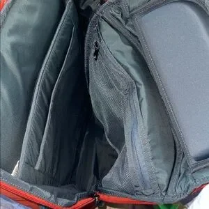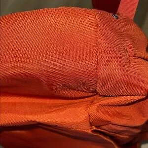 Features top handle. Zip compartment on both sides. Front zip pocket. Interior: padded laptop pocket, zippered mesh sleeve. Padded back & straps for extreme comfort & support. Color is burnt orange/red.