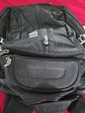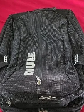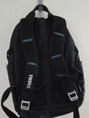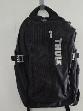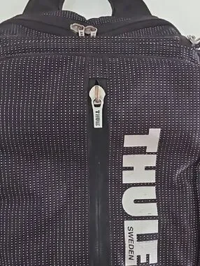 Rugged Thule backpack built for daily commuting and travel. Multiple pockets and zip compartments for organized storage. Padded shoulder straps and top handle for comfortable carry. Reflective logo and accents enhance visibility. Durable fabric with secure buckles and side pockets. Sunglasses pocket, shaped like a case, is hard and secure.