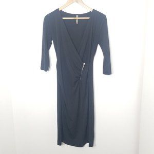 Thyme Maternity Black Surplice Zip Detail Faux-Wrap Dress Midi Length 3/4 Sleeves Little Black Dress Stretch Blend Fabric Size XS