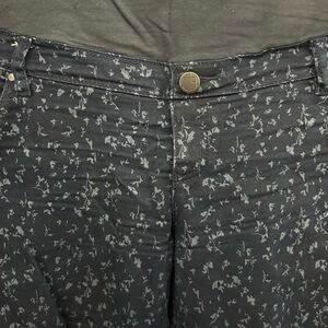 Very stretchy and comfy maternity pants in dark blue with lighter blue floral pattern. False fly button and soft belly band. These pants taper at ankles creating a skinny jean look, but are very stretchy. 21” across waistband and 22” across hips. 70% cotton, 28% polyester, 2% spandex. Waist band is 91% cotton and 9% spandex. Excellent used condition.