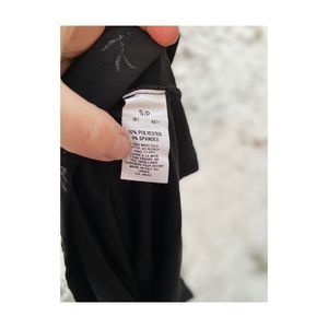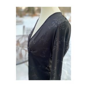 Size S on tag. Polyester and spandex blend. Long sleeve. V neck with Surplice bodice. Slightly flaring at the hem. Very flattering with trousers or dressed down with a pair of jeans. No rips, tears or stains. Pet and smoke free home.
