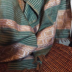 Excellent preowned condition, green, woven, Tibetan scarf with golden and silvery pattern and striations throughout. Has a fringed edge. A nice balance of subtlety and colour. Unsure about the composition, but I was told that it contains real silk. Was purchased from the Snow Lion, Tibetan shop in Toronto. Made in Nepal or Tibet. Really quite beautiful.