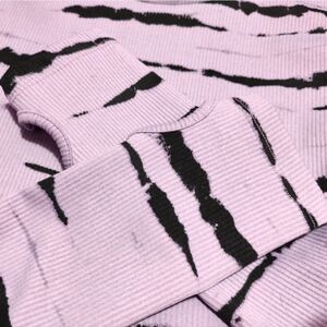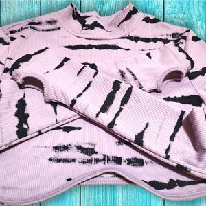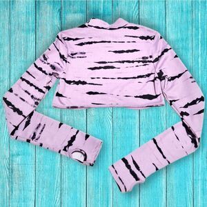 Crop top in soft jersey ribbed knit with a stand-up collar, extra-long sleeves with thumbholes, and corset contour hem. This is a tight thick knit. Tie Died in Tiger Stipe Pattern. NWOT, No Flaws.
