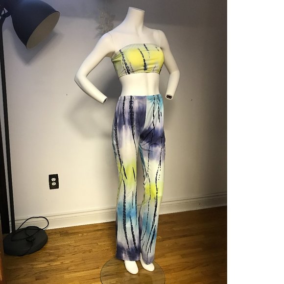 No tags, never worn, Bright tie dye Flare leg stretchy leggings and Bandeau Bikini top streetwear. Waist 14", hip 20.5, from top of the waist to bottom pant 43" long. Smoke free, pet free.