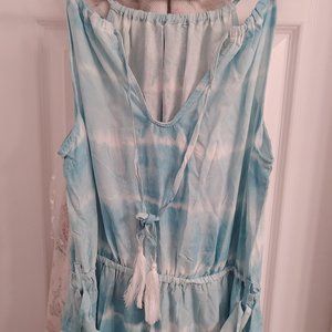A gorgeous light blue and white tie dyed maxi dress with two white tassels to fasten at the neckline and a matching tie dye sash around the middle.