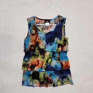 Vintage/Retro Libra Tie Dyed Ruffled Tiered Sleeveless Blouse in Green, blues & Orange. Size Medium. 18.5 inches ptp aprox. Length is just past hip. Semi Sheer, but has frontal lining.Gently preloved great condition. Boho Style, very feminine. Late 1990s.