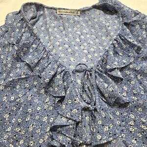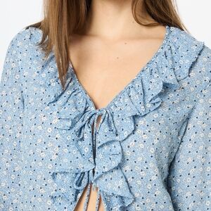 Light blue patterned blouse with two ties in the front and a ruffle collar.
