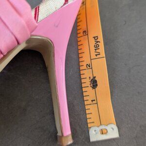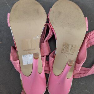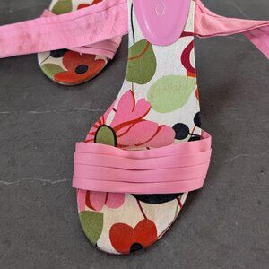 Bubblegum pink pleated ribbons tie up the leg on a sexy summer sandal. Patent heel and floral print on insole.