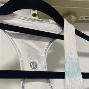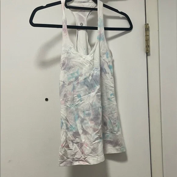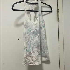 racerback tank with a soft tie-dye pattern. Features pastel hues on a light base.