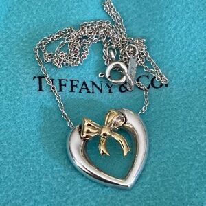 In excellent preowned condition, pretty much looks line new, authentic vintage 1991 Tiffany & Co. sterling silver and 18K yellow gold heart with bow ribbon pendant hanging from a 16" Tiffany sterling silver chain.