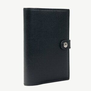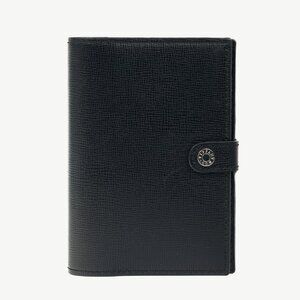 This passport cover from Tiffany & Co. is crafted in a black grained leather, and features a snap-closure strap with silver-tone hardware, Tiffany blue leather lining on the interior, and a slip pocket.