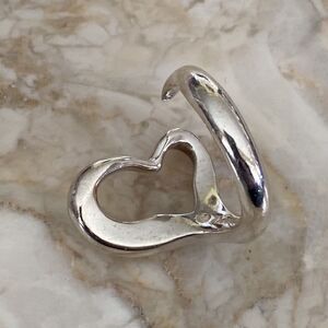 In excellent preowned condition gorgeous authentic Tiffany & Co. Elsa Peretti heart ring in solid sterling silver. Elegant and stylized design, this beautiful ring has some nice weight to it.