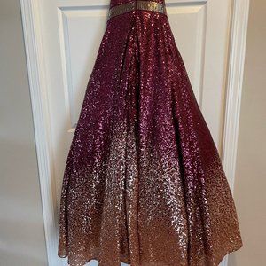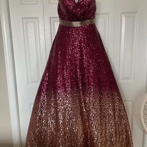 Size 6 head-to-toe sequin ball gown, with a burgundy and gold ombre effect and gold band. Sweetheart neckline, and includes pockets. It has been tailored in a half-inch on the bust for a tight fit. Worn once.