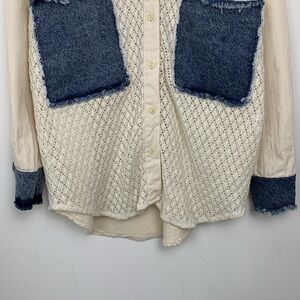Unique boho-chic button up shirt featuring a knit crochet fabric with denim patch pockets and frayed denim cuffs. Collared neckline with a relaxed fit.