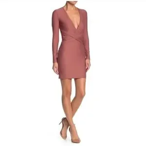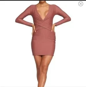 High stretch bodycon, super stretch, super soft, lined, mini dress with deep V plunge neckline, & wrap waist detail