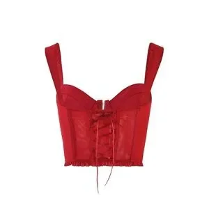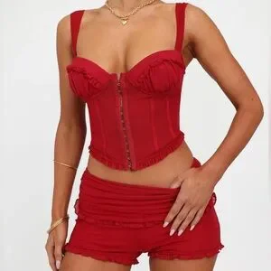 Bold red set with structured design. Features zipper front and ruffled details. Perfect for a stylish look.
