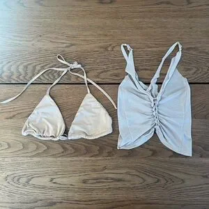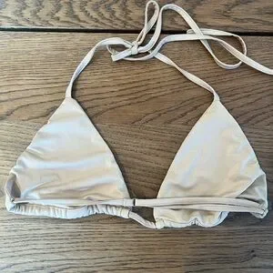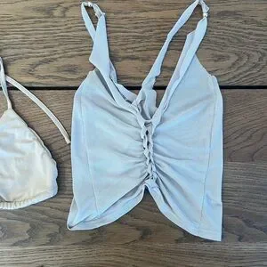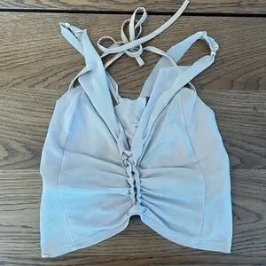 This top is versatile with its sheer over lay top over a nude bathing suit style top. Little gold beads and fabric twist detail. Never worn.