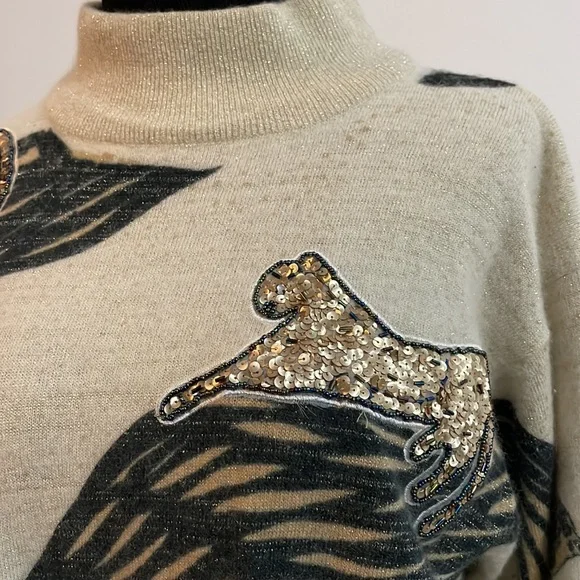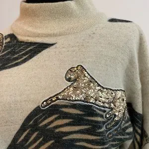 This is the coolest sweater ever! Hard to photograph but it a metallic knit with sequined tigers. Ever buy something bc you love it so much even though it doesn’t fit? Yup I did it. Super bummed it doesn’t fit me. I’m pretty sure it is eighties vintage.
