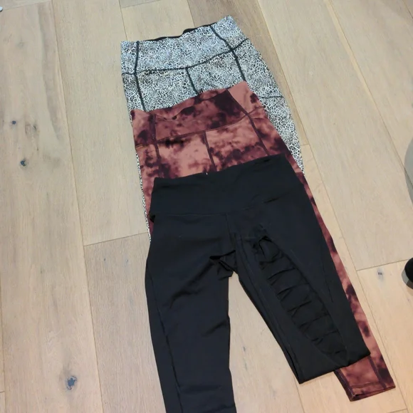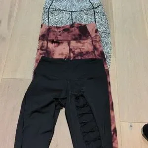 Victoria secret sport tights. Leppard print capris size small, high waisted with pockets on the side. Tye die size 6 very soft material high waisted, anckle length, pockets on the sides. Black long length, size small high waisted with a sexy see through material up to the knee in the back of the leg.