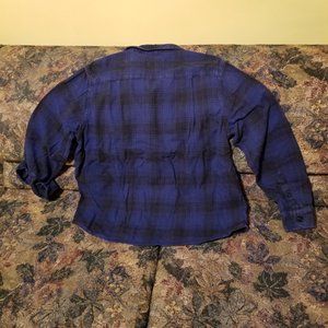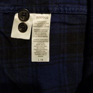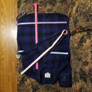 Relaxed fit or oversize, casual, out door adventures, plaid/check flannel, soft, 100% cotton shirt/jacket/shacket, blue and black, front pockets, rounded base, Tilley Endurables - inspired by life out of doors. New today ~$170. Good condition, not much wear. Machine wash cold, dry on low heat. Size large, L, or oversize medium, M, measurements in inches: pit to pit 20, base width 22, length ~25.5, sleeve length 22, cuff turned up ~20.