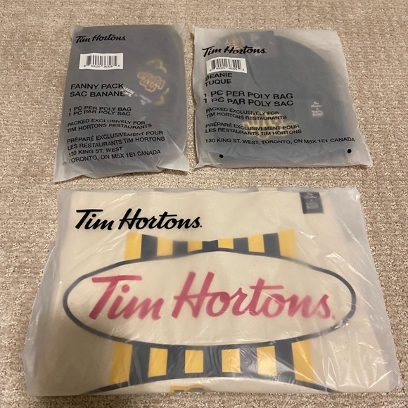 Includes fanny pack, beanie and tote bag.