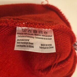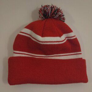 Cozy Tim Hortons pom toque in classic Canada colours. Red knit with white stripes, fold-over cuff and a white maple leaf patch. Unisex adult fit.