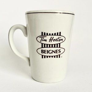 In good condition, this bilingual Tim Hortons mug features their retro logo with word “Donuts” on one side and “Beignes” on the other.