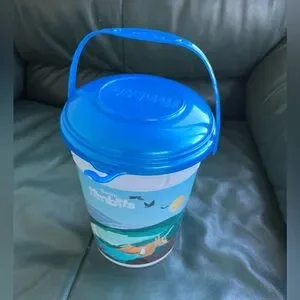 Tim Hortons bucket with a blue lid and handle. Features a scenic design.
