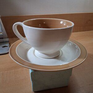 Enjoy your tea time with the elegant tea set. This set features a classic white and tan design, perfect for any kitchen decor.