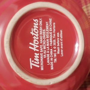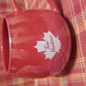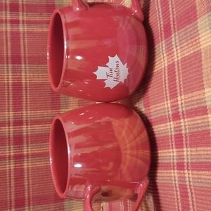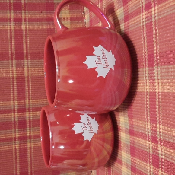 Pair of red iridescent Tim Hortons mugs for tea or coffee.