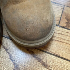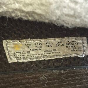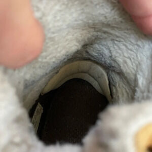 They have some wear to the exterior due to a muddy last walk in them. We have added soft heel protectors, which can be removed, and elastic laces as he didn’t like tying.